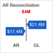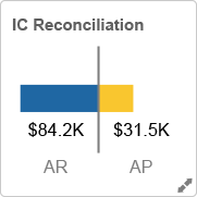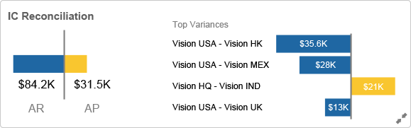 The expanded view shows the top four variances.Blue bars represent receivables variances and yellow bars represent payables variances.Click on any of the Top Variances amount to view the report of unposted transactions and open items.