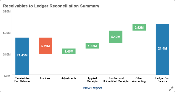Accelerates reconciliations by analyzing differences between the ledger balance and subledger balances of receivables accounts. Links to the reconciliation report for the transaction details needed to resolve variances.