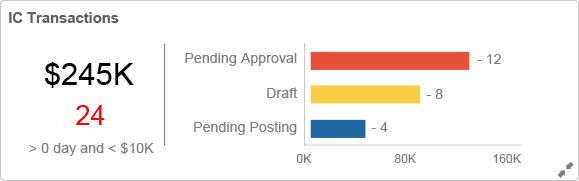 The expanded view graphs outstanding transactions by status:Transactions Pending Approval, including rejected transactionsDraft transactions, including newly created transactions and transactions with errorsTransactions Pending Posting, including those that have not been transferred to Receivables, Payables, or General Ledger