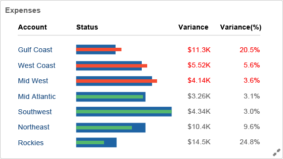 The expanded view provides list of all the expense accounts you are tracking, their performance against target, and drills to the Account Monitor.