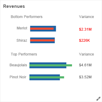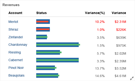 Highlights the best and worst performing revenue accounts determined by the variance between current period results and a target or baseline, such as budget or prior period results.