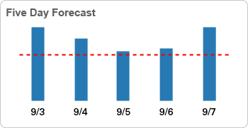 Displays the five day cash forecast taking into account the likely cash inflows and outflows from Payables, Receivables, Payroll, and Cash Management. The dotted red line represents the sum of the target balances.