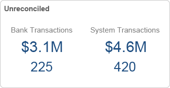 Evaluates pending bank reconciliation activity by displaying the total amount and count of unreconciled bank statement lines and system transactions.