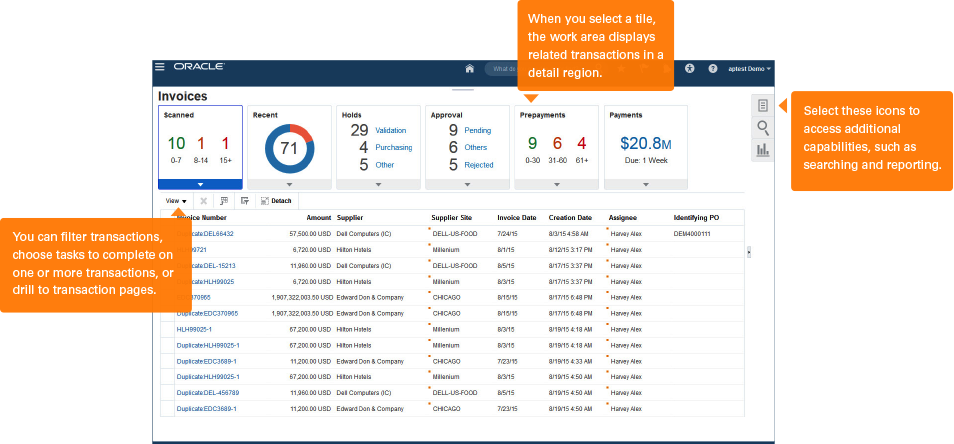 The Invoices work area for the Accounts Payable Manager increases efficiency and productivity by speeding the processes to complete scanned invoices, resolve invoice holds, approve invoices, make prepayments, and pay invoices coming due.