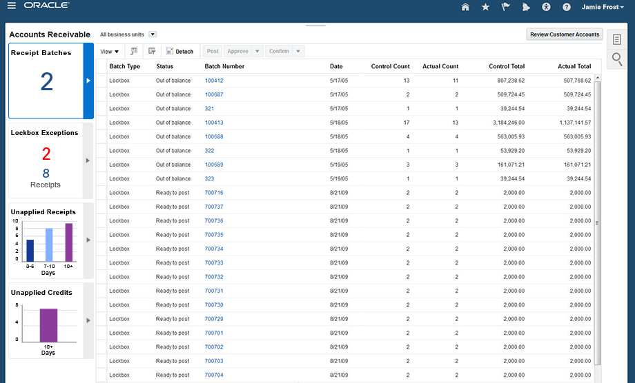 Receipt Batches: Summarizes receipt batches that require further processing including manual receipt batches, lockbox batches, and automatic receipt batches with the status of Out of Balance, Ready to Post, Pending Approval, or Pending Confirmation.
