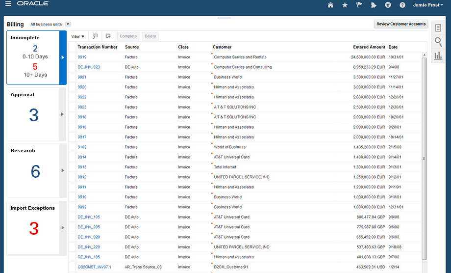 The Billing work area streamlines daily activities in the billing department by pinpointing issues that require attention, such as incomplete invoices, adjustments that require research and approval, and Auto-invoice import errors.