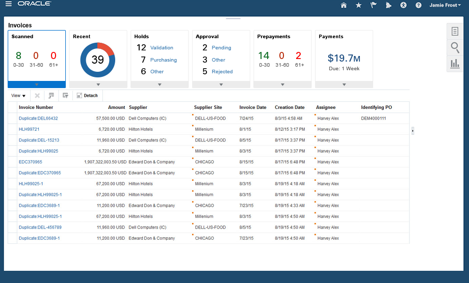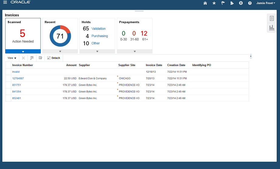 The Invoices work area for Accounts Payable Specialists increases efficiency and productivity by speeding the processes to complete scanned invoices, resolve invoice holds, manage invoices and view available prepayments.
