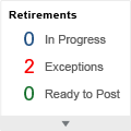 Depreciation: Displays the current depreciation period to allow you efficiently manage period close activities such as calculating depreciation, closing the period, and copying to tax book. You can drill to view completed additions and retirements for the open period to manage any remaining workload.