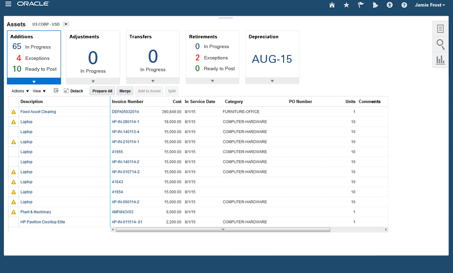 Additions: Groups pending additions from Payables, Projects and other sources by status. Highlights additions that are missing mandatory information such as Asset Category or Expense Account. You can take action directly or by using an integrated spreadsheet to complete the asset additions.
