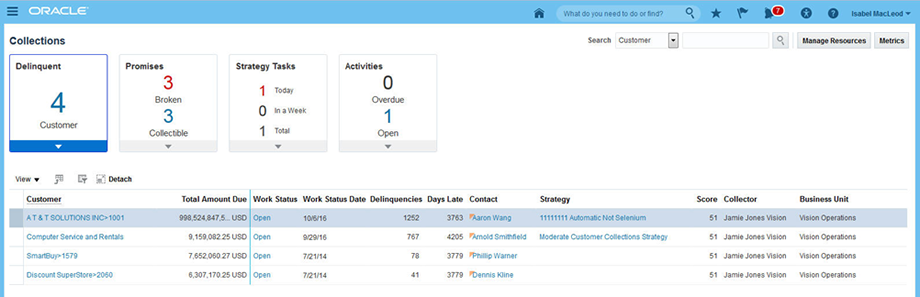 The Collections work area provides capabilities to automate the collection process by allowing collection agents to focus on work assigned to them and follow up on tasks. Use the new Collections work area to more efficiently manage work assigned to individuals and to prioritize the delinquent customers, promises, strategy tasks, and activities, and review collections data from the infolets.