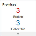 Promises: Summarizes both number of broken and open customer promise information to the collections agents. The agent can review in detail, the status, date, and amount of each promise.