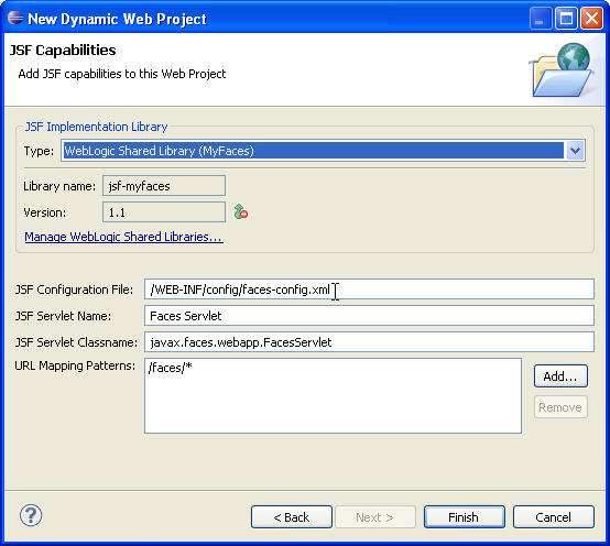 11. Now we configure the JSF facet. Choose WebLogic Shared Library (MyFaces) for the JSF implementation. Then, change the default path of the JSF configuration file to be /WEB-INF/config/faces-config.xml.