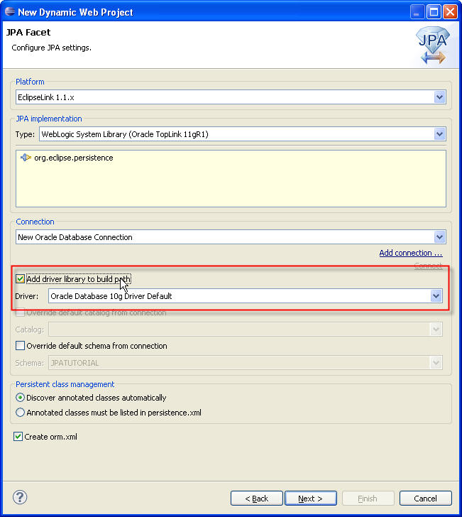 This tutorial provides step-by-step instructions on how to create a Web application that uses the Java persistence application programming interface (JPA) version 2.0 with Oracle WebLogic Server 11g release 1, Spring, EclipseLink, JavaServer Faces (JSF), and Oracle Database XE. You will develop this application using Oracle Enterprise Pack for Eclipse 11g release 1, Patchset 1. During the process of creating this application, you’ll also get a sneak peek at planned enhancements to the Eclipse Web Tools Platform.