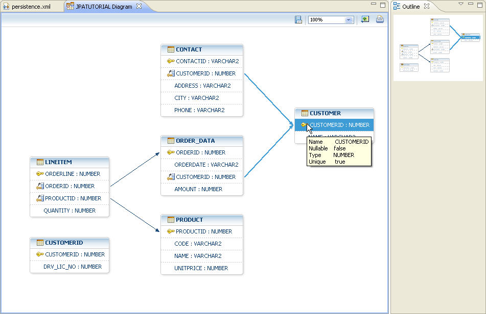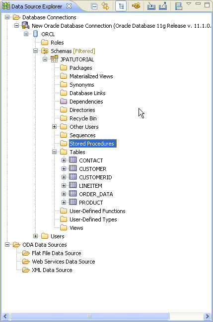 1. In the Data Source Explorer, expand the nodes inside the New Oracle Database Connection node. You can view the individual tables and columns. Observe that the Data Source Explorer denotes which columns have been designated as primary keys. Note that the tables shown below are stored in the JPATUTORIAL schema.