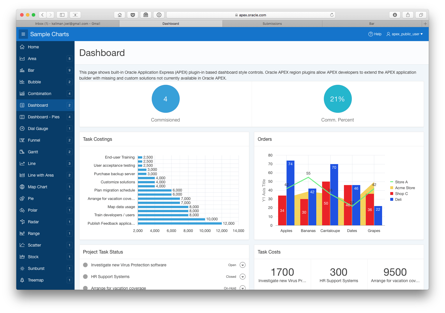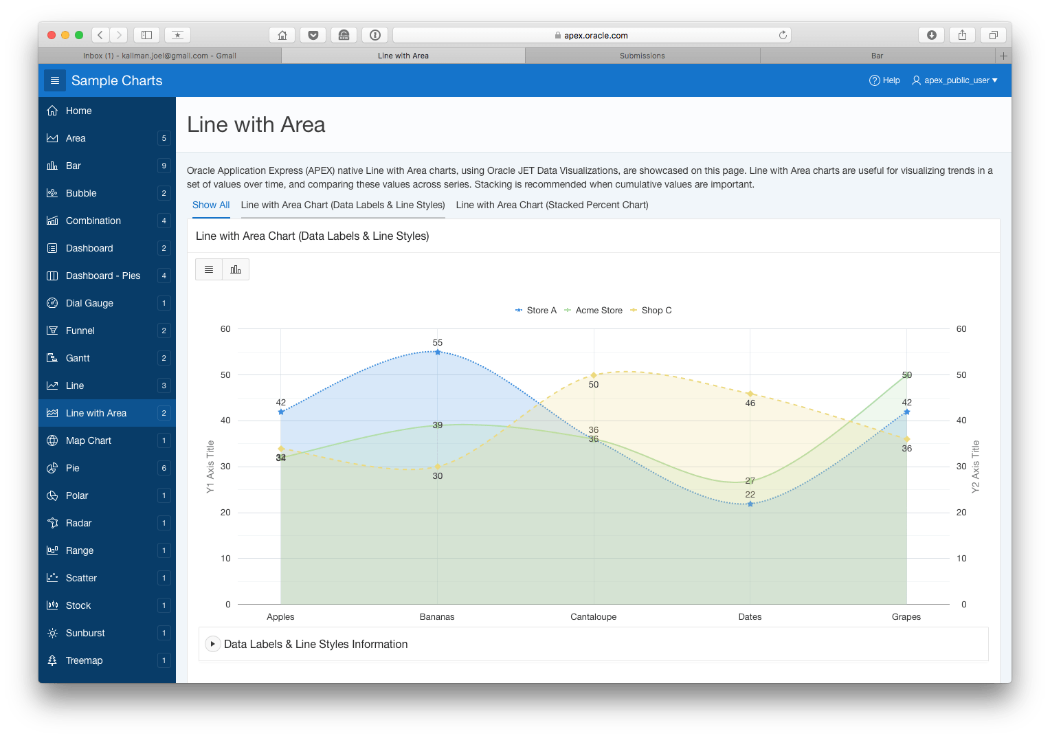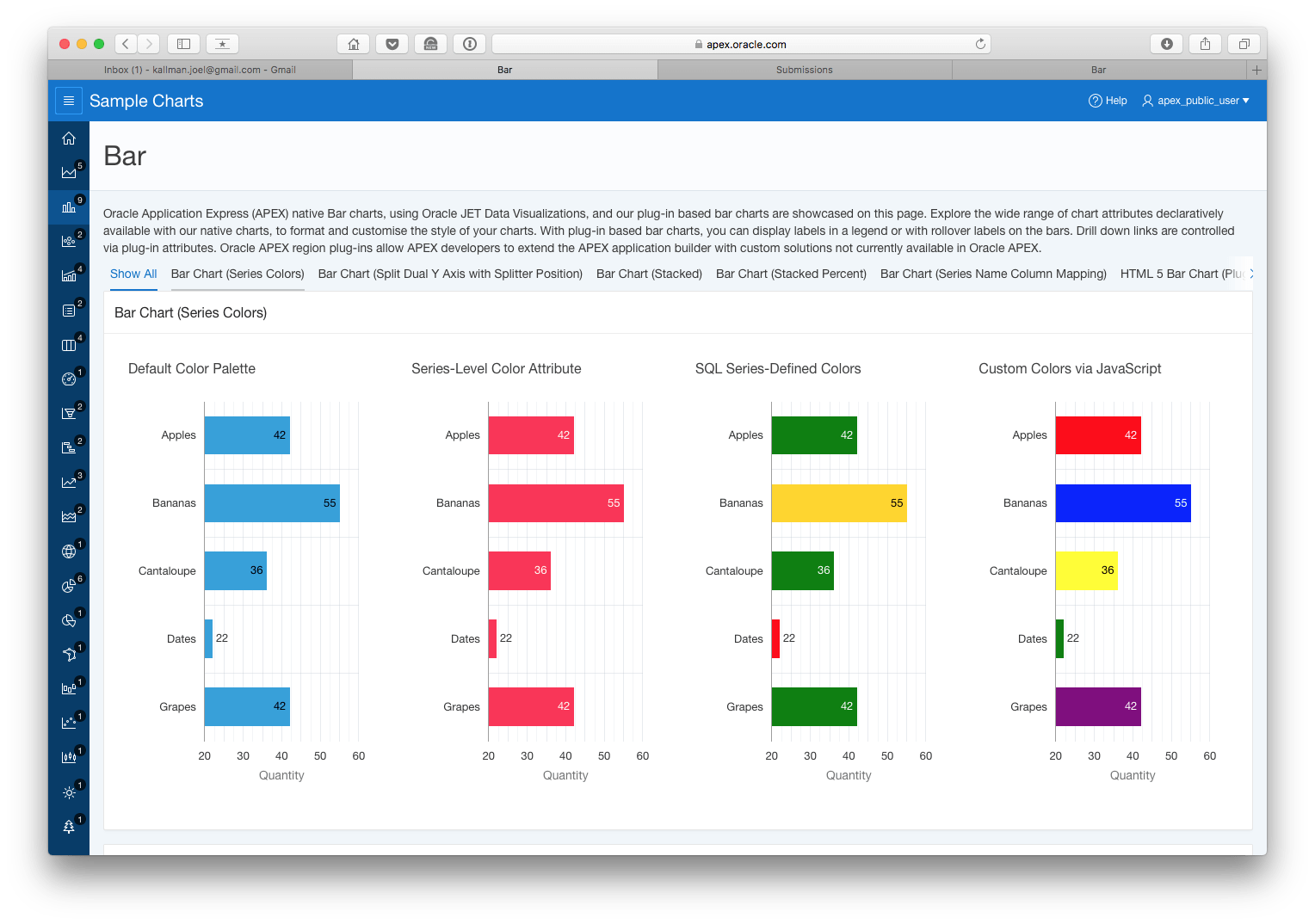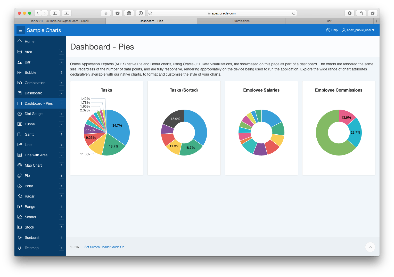 It is fantastic to be able to offer our customers the most extensive range of chart types in any Oracle Application Express release to-date. The comprehensive Oracle JET documentation, and accompanying Data Visualizations Cookbook, have been of great assistance during our integration efforts. They are also a great source of information for our customers wishing to customize their charts with additional attributes, that may not be declaratively supported in Oracle Application Express. Oracle JET is used for the development of many Oracle Cloud products. As our customers use Oracle Application Express to extend their Oracle Cloud services, we can now offer a more consistent user experience through the integration of Data Visualizations. Hilary Farrell, Consulting Member of Technical Staff, Oracle Application Express product development