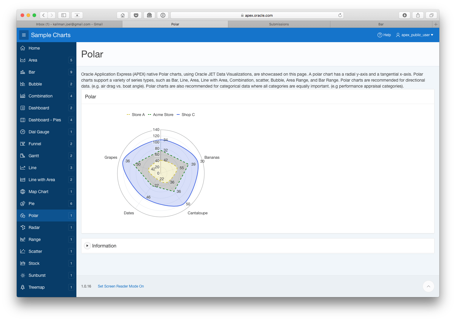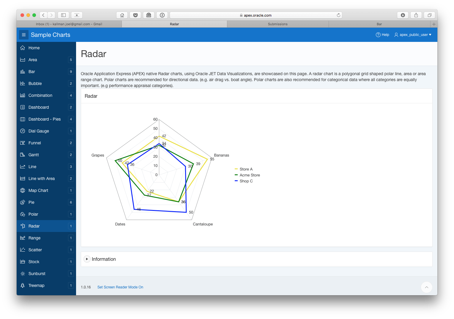 It is fantastic to be able to offer our customers the most extensive range of chart types in any Oracle Application Express release to-date. The comprehensive Oracle JET documentation, and accompanying Data Visualizations Cookbook, have been of great assistance during our integration efforts. They are also a great source of information for our customers wishing to customize their charts with additional attributes, that may not be declaratively supported in Oracle Application Express. Oracle JET is used for the development of many Oracle Cloud products. As our customers use Oracle Application Express to extend their Oracle Cloud services, we can now offer a more consistent user experience through the integration of Data Visualizations. Hilary Farrell, Consulting Member of Technical Staff, Oracle Application Express product development