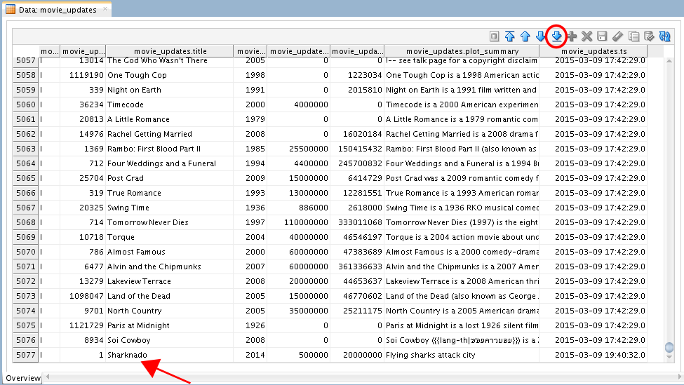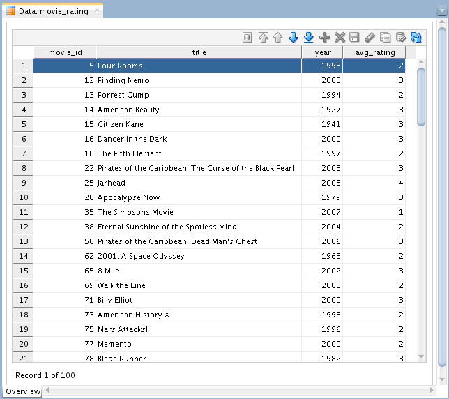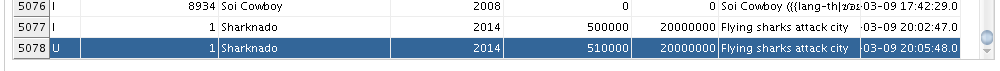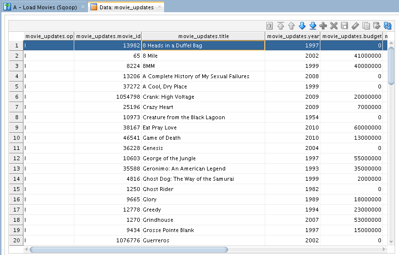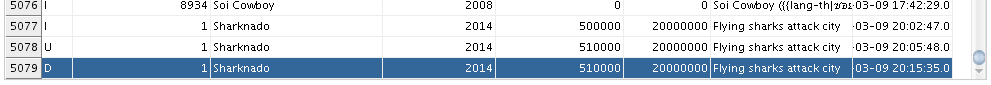 ODI Studioのデータ・ビューアに戻ります。再度スクリーンをリフレッシュし、最終行に移動します。movie id 1のエントリとして、操作タイプが"D"の新しいエントリがもう1つあることを確認します。これは、表からの削除を意味します。