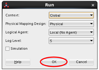 注:環境によっては、実行に数分かかることもあります。生成されるコードのみ表示するには、チェック・ボックス「Simulation」を選択します。そうすると、生成されたセッションがダイアログ・ウィンドウに表示され、オペレータには実行内容が何も表示されません。