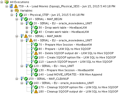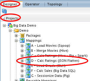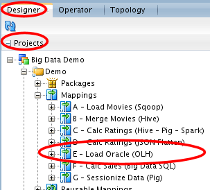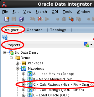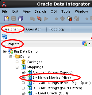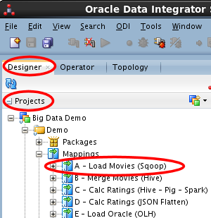 Oracle Data Integratorを使用すると、データの移動および変換に必要なマッピングを作成できます。この手順では、Oracle DBソースからHiveのターゲット表にデータをロードするために必要な既存のマッピングを確認して実行します。