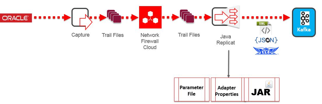 Oracle GoldenGate for Big Dataには、GoldenGateで取得した変更をKafkaにレプリケートできるコンポーネントが組み込まれています。また、CSV形式だけでなく、JSON、XML、Avroなどさまざまな形式のデータを変換する機能を提供しています。Kafkaハンドラの例でのGoldenGateのプロセスは次のとおりです: