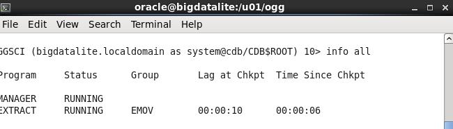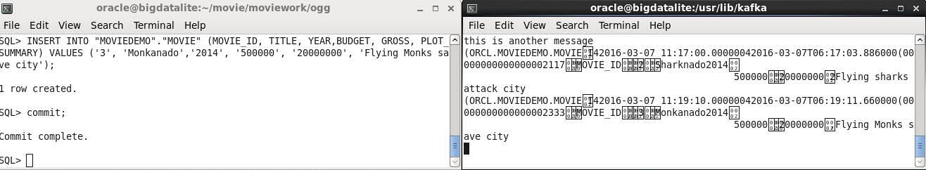 Oracle GoldenGateを使用すると、完了したトランザクションをソース・データベースから取得して、変更内容をターゲット・システムにレプリケートすることができます。Oracle GoldenGateは、システムに負荷をかけずに優れたパフォーマンスでこうした変更を確実に取得および適用します。Oracle GoldenGate for Big Dataは、GoldenGateで取得した変更をさまざまなHadoopターゲット・テクノロジーにレプリケートするためのコンポーネントです。このチュートリアルでは、OracleのMOVIE表への挿入を、対応するHiveのmovie_updates表にレプリケートします。Oracle GoldenGateはGoldenGate for Big Dataを通じてこの機能を提供し、Hive、HDFS、HBase、Flume、およびKafka向けのアダプタを提供します。この例では、最初にHiveの例を使用し、その後、Kafkaへの配信メカニズムのデモも行います。