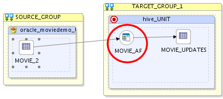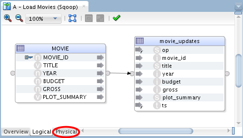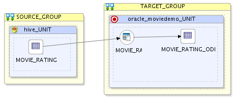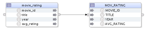 マッピングの論理ビューに表示されるのは、Hive表movieからOracle表MOVIEへのダイレクト・マップです。属性上の変換は実行されません。
