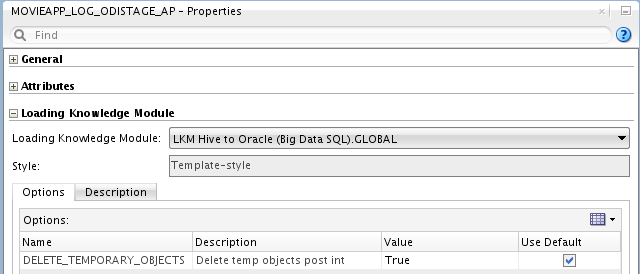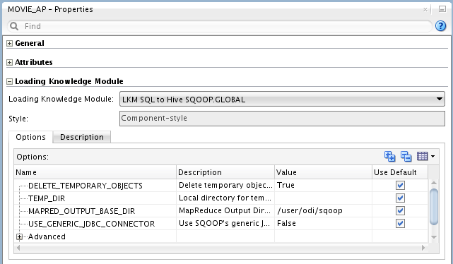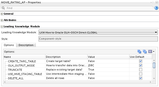 アクセス・ポイント「MOVIEAPP」を選択し、PropertiesウィンドウのLoading Knowledge Moduleタブを確認します。外部表定義を介してOracleからHive表にリモート・アクセスできるように、LKM Hive to Oracle (Big Data SQL)が選択されています。LKMのオプションはすべてデフォルトです。