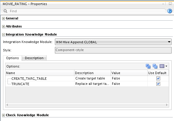 ターゲット「MOVIE_RATING」を選択し、PropertiesウィンドウのIntegration Knowledge Moduleタブを確認します。デフォルト設定でIKM Hive Appendが選択されています。