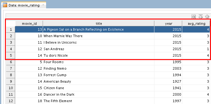 - ターゲット表movie_ratingには、結合の結果が格納されます。これは、すべての言語で丸め処理を可能にするユーザー定義関数XROUNDを使用します