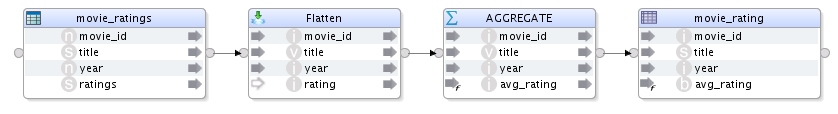 また、この章の一部として、ネストしたJSON HDFSファイルを入力として使用し、コンテンツ上で映画レーティングを計算できるようにフラット化するマッピングも示します。使用する実装エンジンはSparkです。