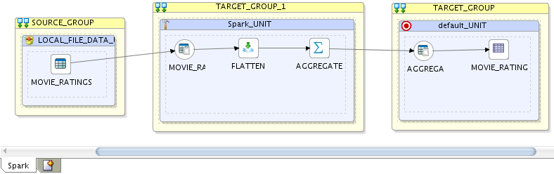 マッピングの物理ビューに切り替え、下部のタブSparkが選択されていることを確認します。3つの実装エンジンそれぞれに物理設計があります。変換ではSparkを使用し、ソースとターゲットはHive Catalogメタデータを使用して定義されているため、ソース、ステージング(Spark)、ターゲット・データ・ストアは別々の実行単位で表示されます。