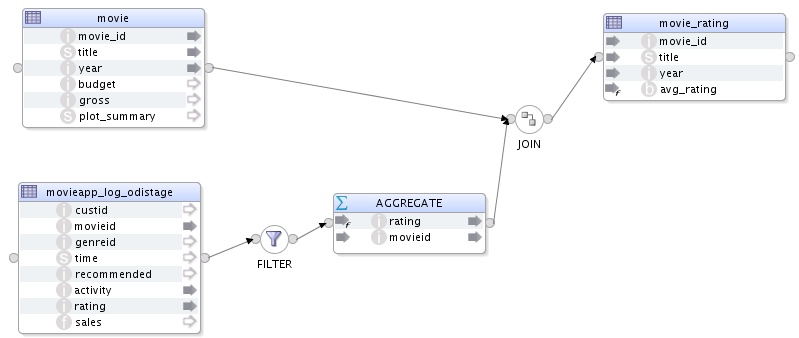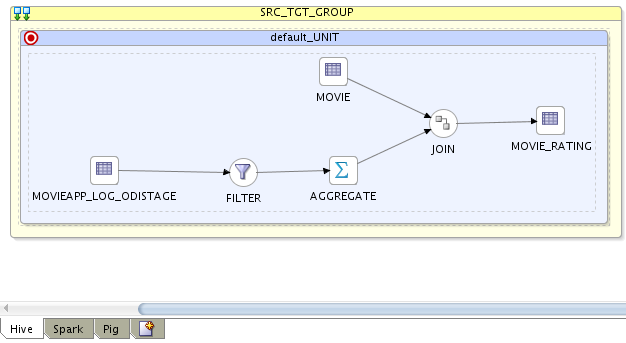 この項では、SqoopとGoldenGateを使用して、事前にロードしておいた映画データをOracle Data Integratorを使用して変換します。このユースケースでは、表movieを顧客アクティビティ・イベント・データと結合します。このデータは、Flumeを使用して事前にHDFSファイルにロードされ、現在はHive表movieapp_log_odistageとして公開されています。アクティビティ・データにはレーティング・アクションが含まれているので、1つ1つの映画の平均レーティングを計算し、結果をHive表movie_ratingに格納します。論理マッピングを1つ作成し、ステージング場所の実行エンジンとしてHive、Spark、Pigのいずれを使用するか選択できます。ODIはHive SQL、Spark-Python、またはPig Latingのいずれかを生成し、適切なサーバー・エンジンでそれを実行します。