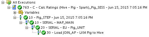 マッピングの物理ビューに切り替えます。変換ではPigを使用し、ソースとターゲットはHive Catalogメタデータを使用して定義されているため、ソース、ステージング(Pig)、ターゲット・データ・ストアは別々の実行単位で表示されます。