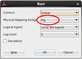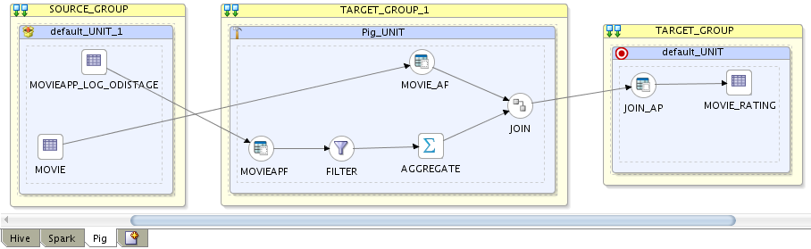 マッピングの物理ビューに切り替え、下部のタブPigが選択されていることを確認します。3つの実装エンジンそれぞれに物理設計があります。変換ではPigを使用し、ソースとターゲットはHive Catalogメタデータを使用して定義されているため、ソース、ステージング(Pig)、ターゲット・データ・ストアは別々の実行単位で表示されます。