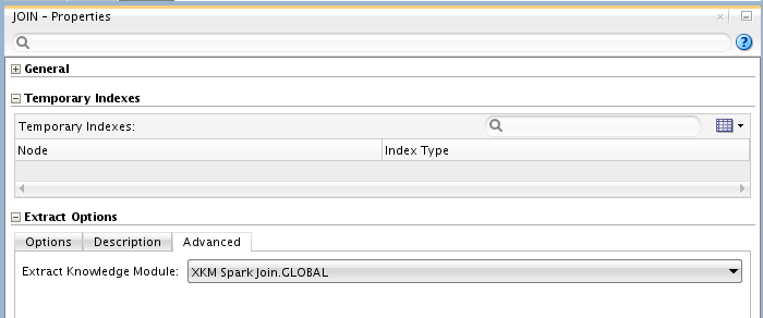 コンポーネント「JOIN」を選択し、PropertiesウィンドウのExtract Optionsタブを確認します。Advancedタブに切り替えると、Extract Knowledge ModuleとしてXKM Spark Joinが自動的に選択されていることを確認できます。このようなXKMは、ユーザーに代わって各コンポーネントのSpark-Pythonコード生成を体系化します。Sparkのメモリの扱いや並列度をチューニングするには、OptionsタブでCACHE_DATA、NUMBER_OF_TASKSなどの詳細オプションを設定します。