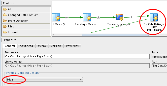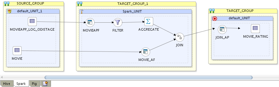 マッピングの物理ビューに切り替えます。表movieapp_log_stageはHiveに含まれ、表CUSTOMERとすべての変換はターゲットOracle DBに含まれているのが分かります。