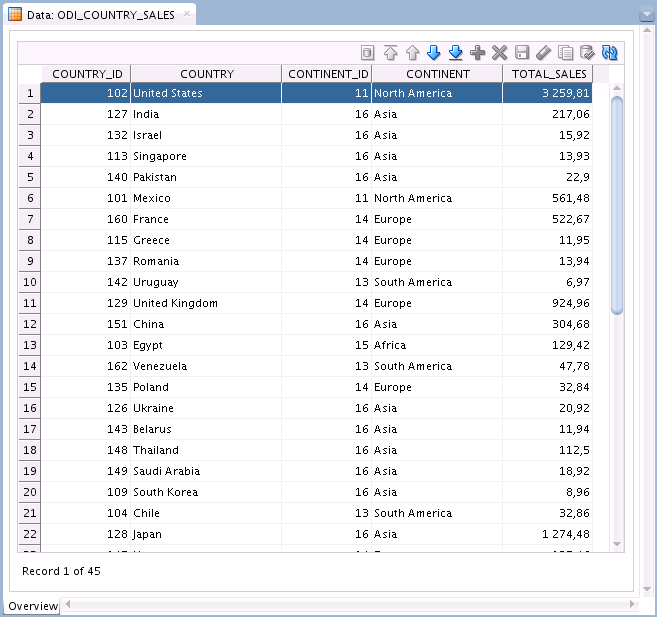 - AGGREGATEは、すべてのレーティングをCOUNTRYとCONTINENT情報に基づいてグループ化し、所定の地域の全アクティビティのsalesの合計値を計算するのに使用されます