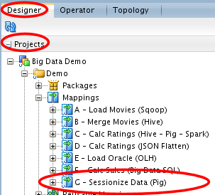このデモでは、ODIとユーザー定義ファンクションとテーブル・ファンクションを使用できる機能を併用して、複雑なPigの複雑なマッピングを実行する方法を説明します。このマッピングでは、このHadoopディストリビューションに含まれるApache DataFuライブラリからPigのファンクションsessionizeを使用します。