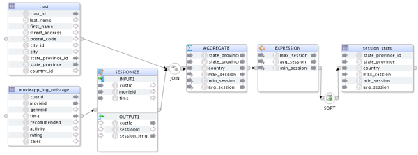 このマッピングの目的は、Hive表movieapp_log_odistageに含まれるアクティビティをユーザー別に独立したセッションに整理し、地域別にセッションの継続時間の最小値、最大値、平均値の統計を算出することです。