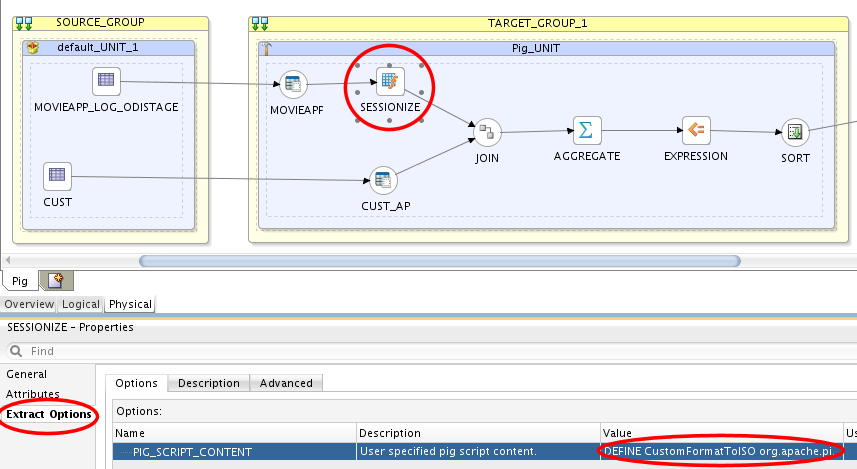 物理コンポーネント「SESSIONIZE」を選択してPropertiesウィンドウに移動します。「Extract Options」タブを選択し、PIG_SCRIPT_CONTENTオプションのValue列をダブルクリックします。