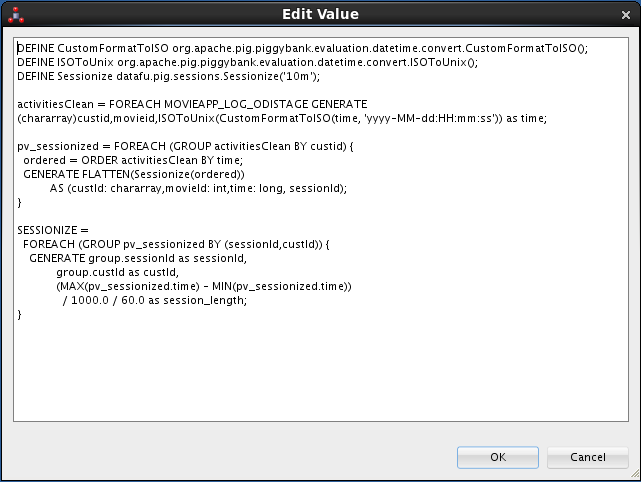 このテーブル・ファンクションの実装に使用されるカスタムPigコードが、ダイアログに表示されます。この実装の核となるのは、DataFuのファンクションSessionizeです。なお、このコードでは、入力リレーションとしてMOVIEAPP_LOG_ODISTAGEを使用し、出力リレーションとしてSESSIONIZEを使用しています。