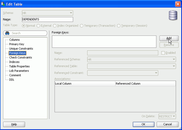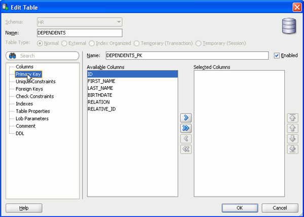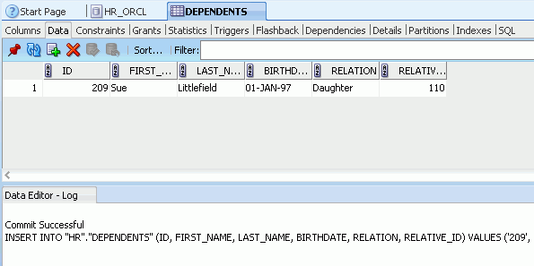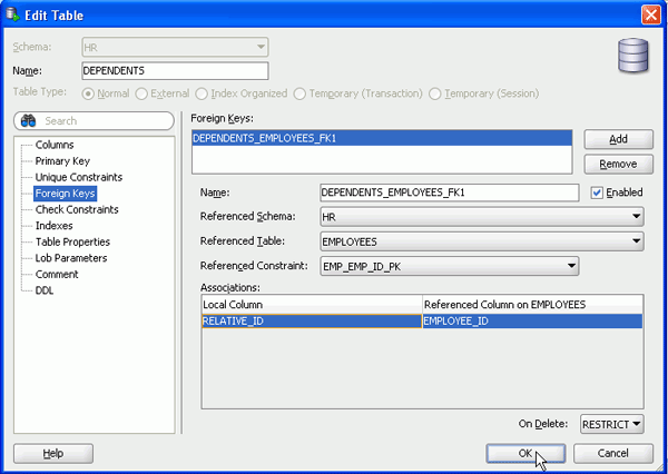 ここでは、DEPENDENTS表に対して主キー制約および外部キー制約を作成します。 以下の手順を実行します。