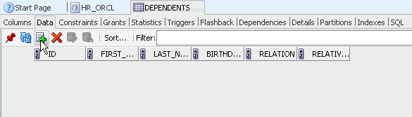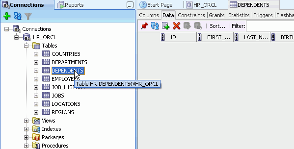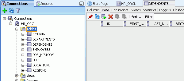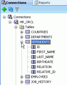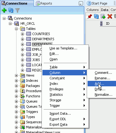 Oracle SQL Developerを使用すると、簡単にデータベース・オブジェクトを変更できます。 ここでは、先ほど作成したDEPENDENTS表に列を1つ追加します。 以下の手順を実行します。