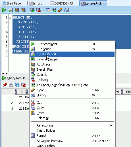HR_ORCL SQL Worksheetで先ほど実行したSQLを選択して右クリックし、「Create Report」を選択します。