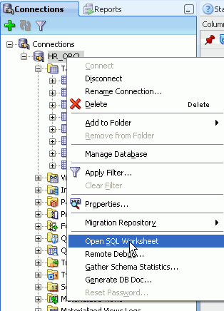 「HR_ORCL」データベース接続を選択して右クリックしたら、「Open SQL Worksheet」を選択します。