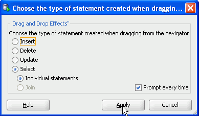 ダイアログ・ウィンドウが表示され、作成するSQL文の種類を指定できます。 SELECT文が選択されたデフォルトを受け入れ、「Apply」をクリックします。