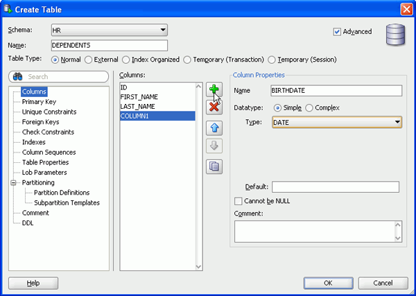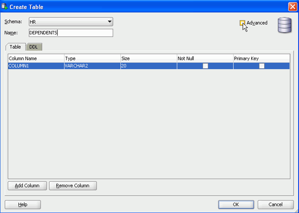 表名にDEPENDENTSと入力し、「Advanced」チェック・ボックスを選択します。