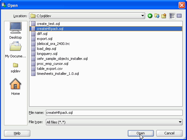 前提条件でファイルを解凍したディレクトリを参照し、「createHRpack.sql」ファイルを選択して「Open」をクリックします。