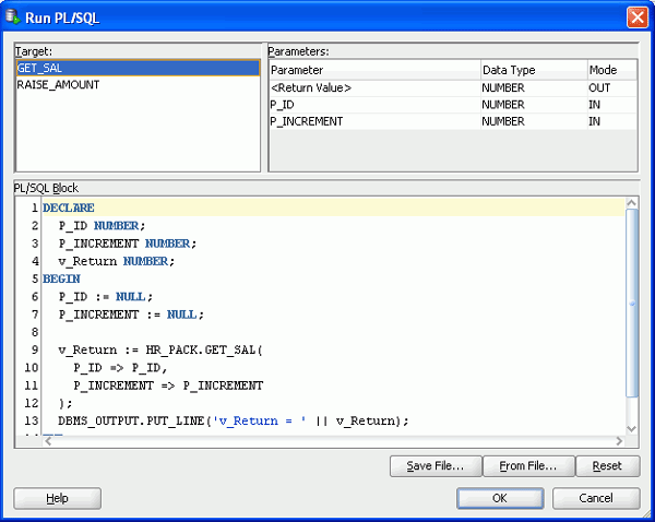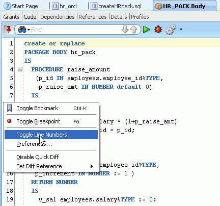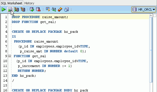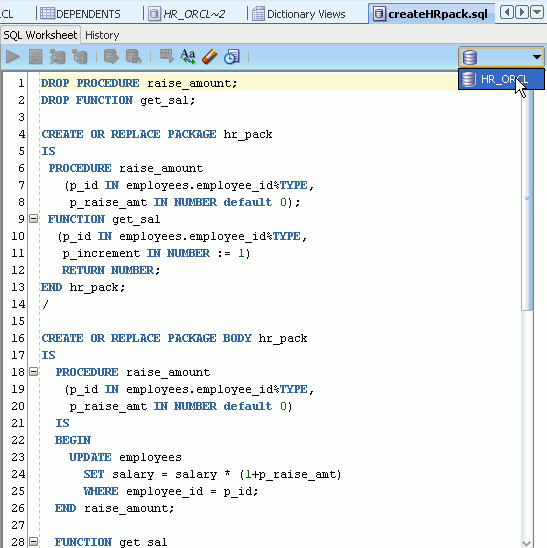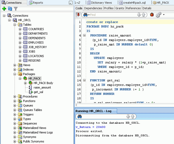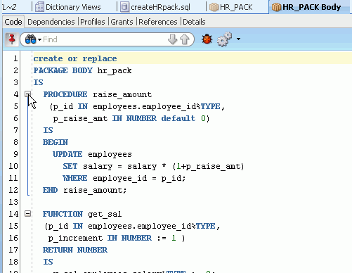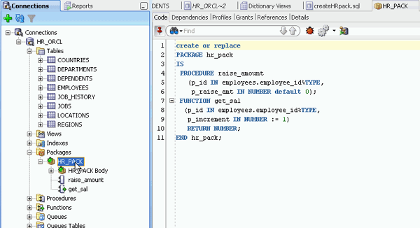 Oracle SQL Developerでは、PL/SQLの編集機能が豊富に提供されています。 ここでは、従業員の給与を調整するパッケージ仕様およびパッケージ本体を作成します。 以下の手順を実行します。