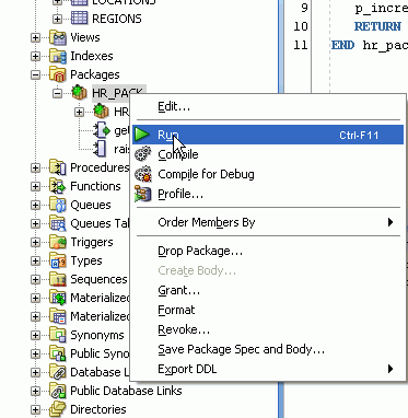 Connectionsナビゲータで「Packages」→「HR_PACK」の順に選択し、右クリックしてから「Run」を選択します。